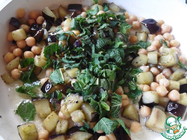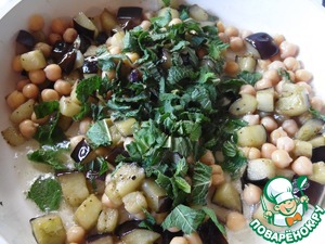 Мяту мелко нашинковать, добавить к баклажанам и нуту. Обжарить еще 3-4 минуты.