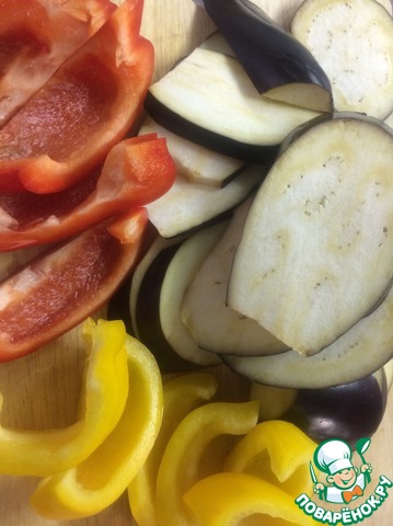 Баклажаны нарезать кружками 0,5 - 0,7 см. шириной. Болгарский перец нарезать полосками такой ширины, какой будет удобно подцеплять вилкой. -