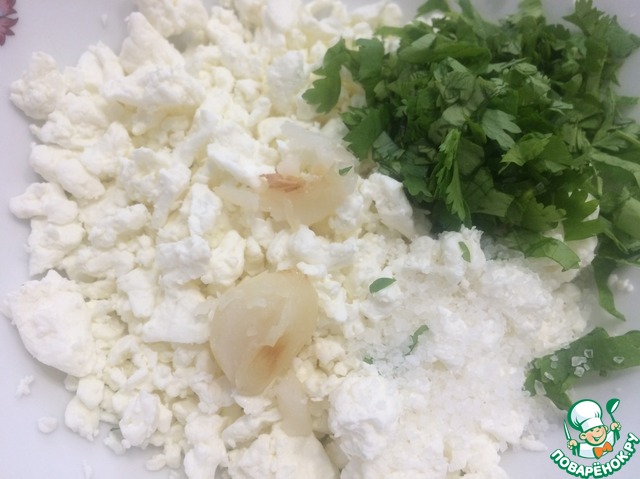 В отдельной мисочке смешать мягкий сыр или зерненый творог, посолить немного, добавить кинзу и чеснок, пропущенный через пресс. Можете добавить и запечённый размятый чеснок. Перемешать.