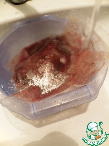 Через три часа десять минут мясо достать, немного подержать пакет под холодной водой для удобства вскрытия и прекращения процесса варки, и открыть пакет.