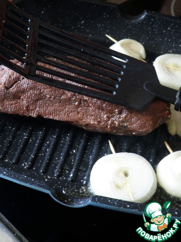 Разогреть сковороду-гриль и очень быстро обжарить мясо по 15 секунд с двух сторон, немного прижимая мясо лопаткой.
