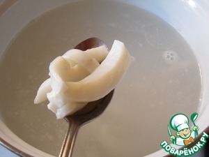 • В другой кастрюле 1 литр воды довести до кипения, подсолить, отварить кальмары 2-3 минуты.