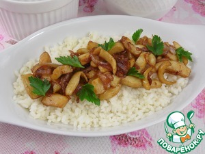 • В тарелку выложить рис, сверху - готовые кальмары.