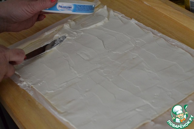 Смазать сливочным сыром тонким слоем по всей поверхности. -