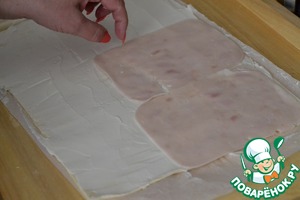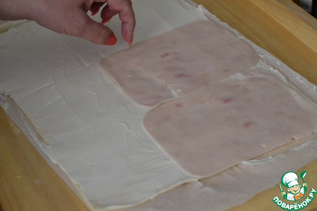 На сыр выкладываем тонко нарезанную ветчину или вареную колбасу