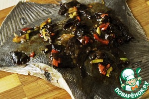 Так как шкурка камбалы довольно плотная, в ней надо сделать небольшие надрезы и густо намазать рыбу маринадом, стараясь, чтобы он проник и в надрезы.