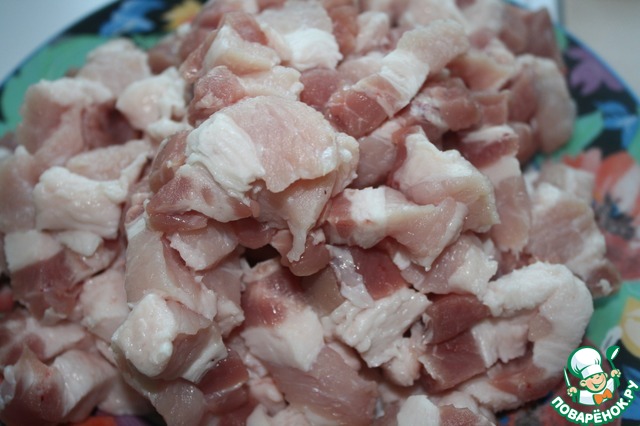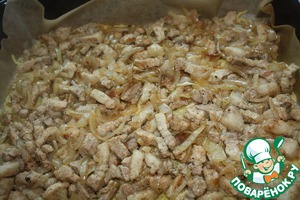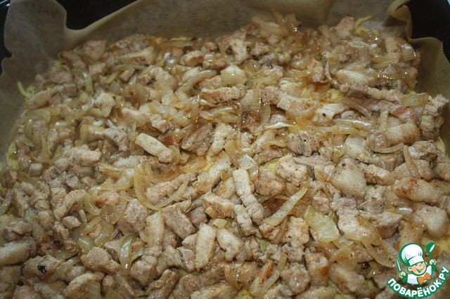 Разогреть сковороду и обжарить мясо до золотистости, затем добавить лук, посолить и поперчить по вкусу.