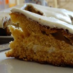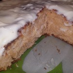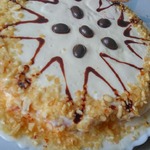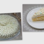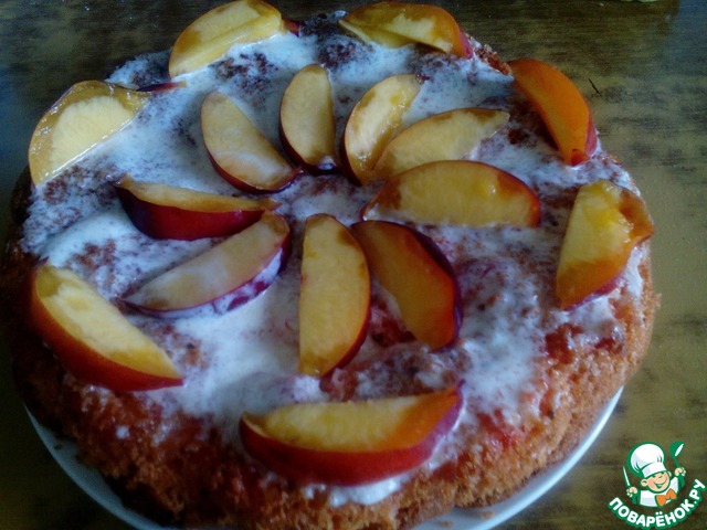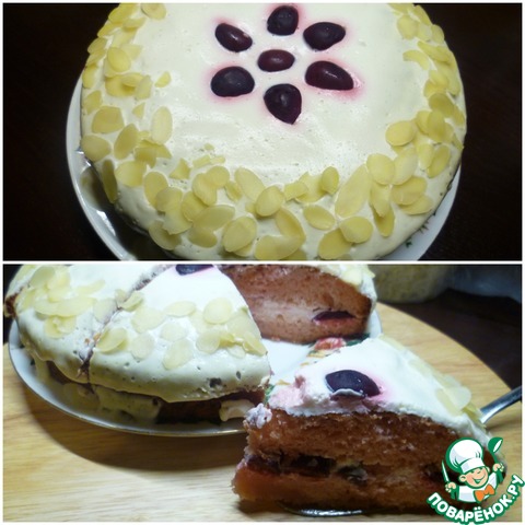 Остывший корж разрезаем вдоль на два коржа, хорошо промазываем кремом сначала нижний, на него укладываем верхний корж и обильно смазываем остатками крема.