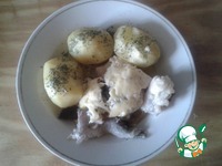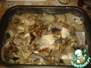 Выложить рыбу в смазанную сливочным маслом форму для запекания, влить бульон и вино, сверху выложить грибы. Рыбу припустить в духовке на минимальной температуре 100 градусов (примерно 14 минут) до готовности.
