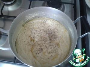 Тем временем, в ковшике или маленькой кастрюльке расплавить примерно 3 ст. л. сливочного масла, и как только оно расплавился, всыпать муку и быстро перемешать. Погреть на минимальном огне ещё минуту эту смесь и остудить.