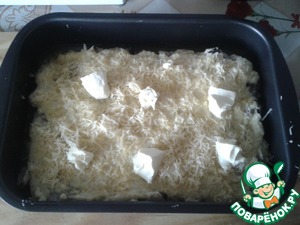 Полученным соусом заливаем рыбу, посыпаем сыром, кладём кусочки сливочного масла, и отправляем в духовку на гриль на 2-3 минуты (расстояния от гриля до формы не менее 15 см!), либо в духовку разогретую до 240-260 градусов, для того чтобы сыр и масло расплавились, а рыба прогрелась.