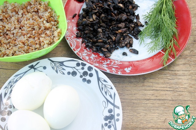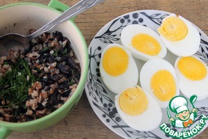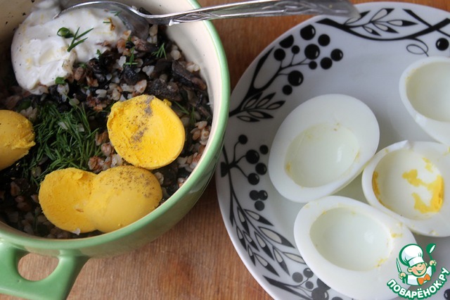 Соединить гречку, грибы и мелко нарезанный укроп. Яйца разрезать пополам.