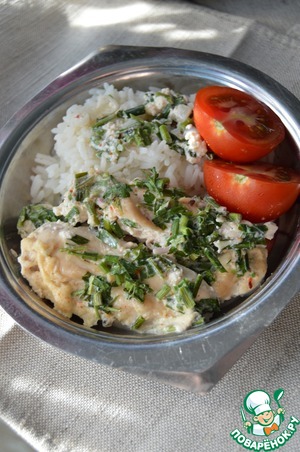 Через 10 минут вливаем в куриные грудки подготовленные сливки с зеленью и запекаем еще 10-15 минут.