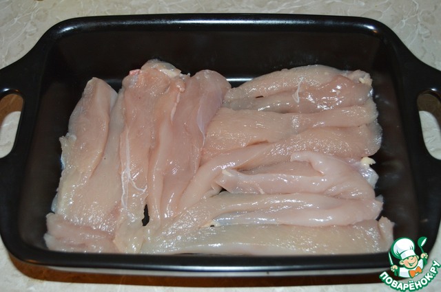 В разогретую до 180 градусов духовку ставим запекаться нарезанное полосками куриное филе на 10 минут.