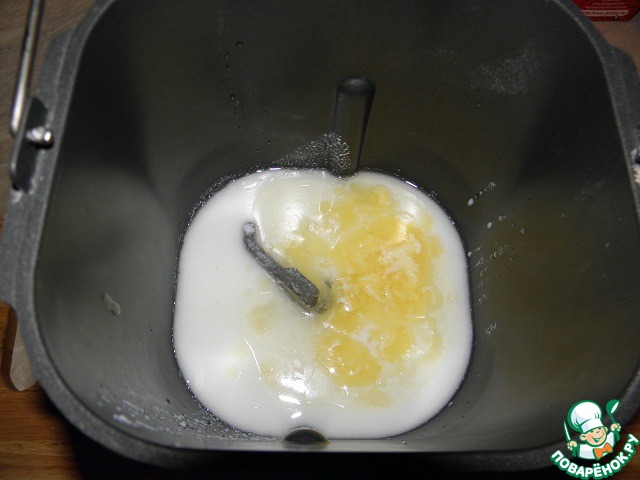 В ведерко влить жидкие ингредиенты – отмеренное количество кислого молока и воды. Затем всыпать соль и сахар, влить растительное масло. Добавить сливочное масло (растопить масло сливочное, удобнее и быстрее это будет сделать в микроволновой печи). Влить в ведерко.