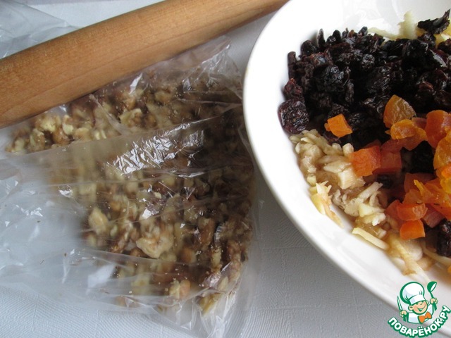 Орехи измельчаем, но не мелко. Можно поместить их в пакет и прокатать скалкой.