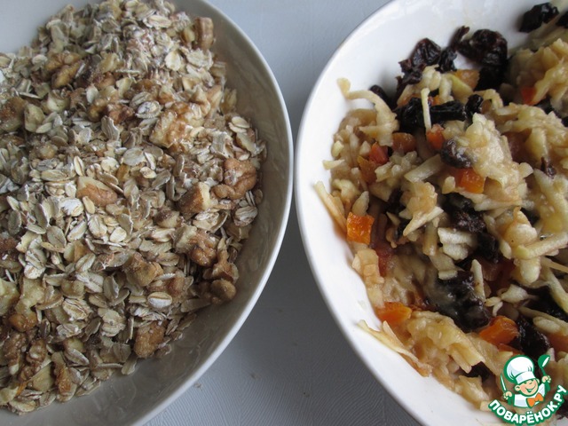 Отступления от рецепта - добавила десертную ложку меда, а сухофруктов положила в два раза больше! А яблоко было одно. В этих пропорциях всё прекрасно получилось!