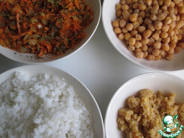 Собираем вместе все составляющие начинки: лук с морковью, нут, рис и красную чечевицу. Всё хорошо перемешиваем и, если надо, то добавляем соль, перец и специи.