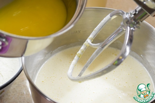 Добавить в 3-4 приема муку и замесить тесто (замешиваем лопаточкой, миксером не взбивать!).