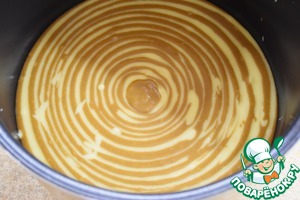 Чашу мультиварки смазать растительным маслом. Если будете печь в духовке, то нужна форма Ø26 см, которую тоже смазать растительным маслом. В центр чаши (формы) выливаем поочередно светлое и темное тесто. Я начинаю выкладывать тесто с 4 ст. ложек и постепенно дохожу до 1 ч. л. в самом конце. Таким образом в пироге получается красивый рисунок с более-менее одинаковыми полосками.