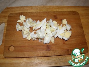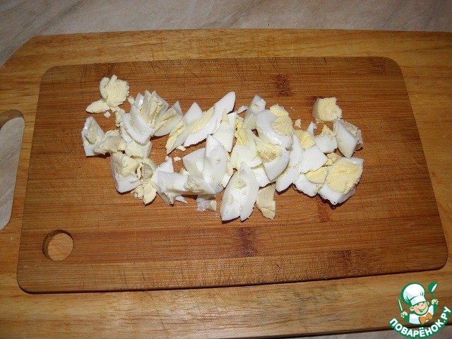 Сварить яйца (после закипания 10 минут) очистить, нарезать