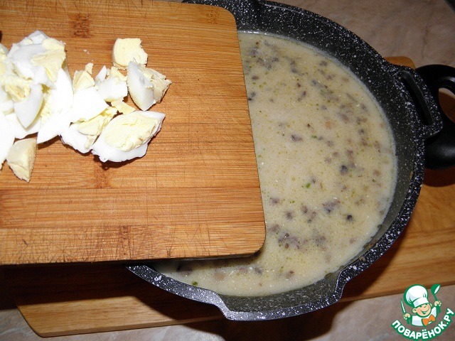 Добавить яйца, перемешать, дать супу закипеть и выключить