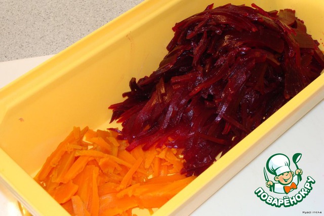 Лук мелко режем, морковь и свеклу шинкуем,