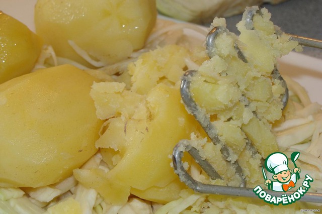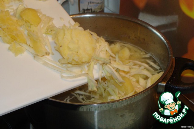 Капусту шинкуем. Минут через 20 вынимаем морковь и картофель (должен быть недоваренным), картофель [b]слегка[/b] толчем на капусте (я чаще делаю это прямо в кастрюле).