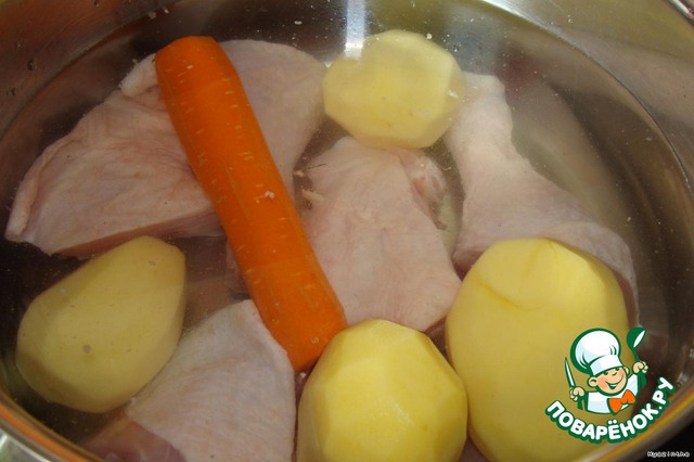 Окорочка рубим на 2-3 части (быстрее сварятся), заливаем 2 л воды; картофель и морковь чистим, моем, отправляем целиком в кастрюлю,