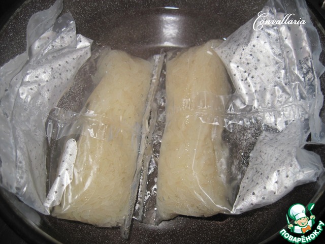 Воду довести до кипения, добавить немного соли и выложить пару пакетиков риса. Варить согласно инструкции на упаковке - 30 минут.