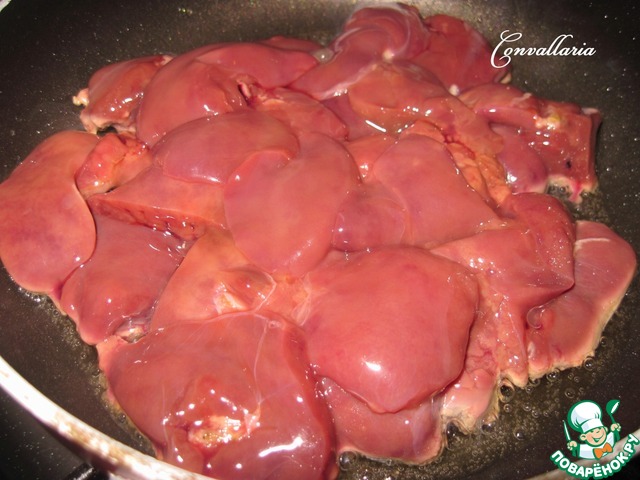 Куриную печень промыть и очистить от пленок. Порезать их на небольшие кусочки одинакового размера. Нагреть в сковороде растительное масло и выложить в нее печень. Помешивая, обжарить на среднем огне в течение 5-7 минут.