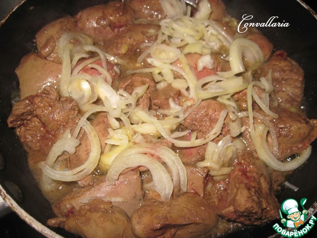 Репчатый лук почистить и нарезать полукольцами, добавить к печени и обжаривать еще пару минут.
