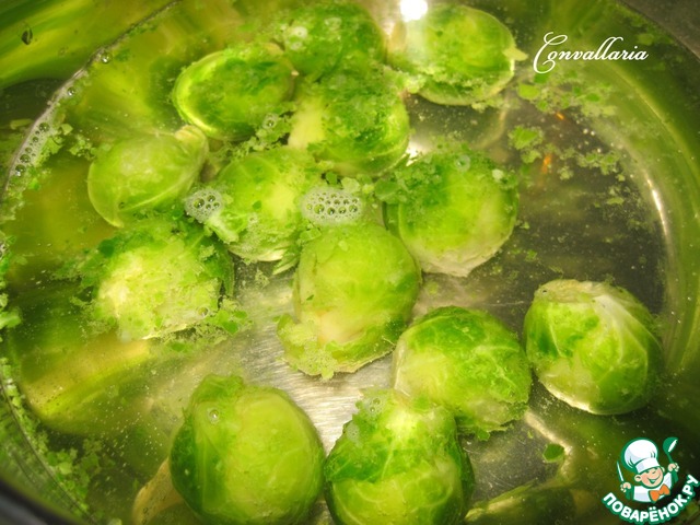 Опустить брюссельскую капусту в кипящую подсоленную воду на 5 минут, затем откинуть на дуршлаг, дать стечь всей воде.