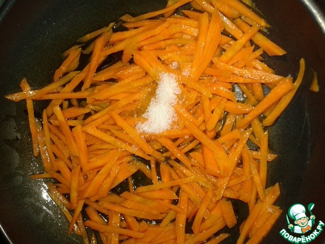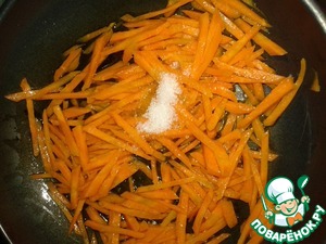 В небольшом колличестве растительного масла обжариваем морковь с 1 ч. л сахара до мягкости