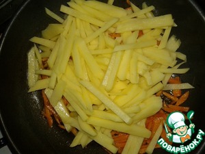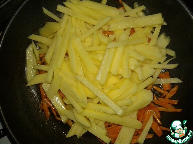 Далее выкладываем начинку... начинку вы можете использовать как у меня.. а можете еще добавить обжареный фарш, зелень... все что вы любите... можете добавить только обжареную морковь или картофель... я люблю именно такую начинку