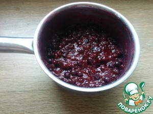 За это время подготовим начинку. Ягоды смешиваем с чайной ложкой сахара. Часть ягод смешиваем с пудингом. Остальную часть ставим на маленький огонь и, все время помешивая, доводим до кипения. Добавляем ягоды, смешанные с пудингом и кипятим еще минуту пока масса не загустеет. Остужаем.