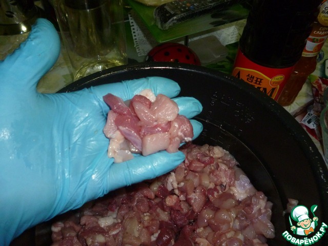 Мясо нарезать кубиками, примерно 1 см. Чеснок мелко порубить.