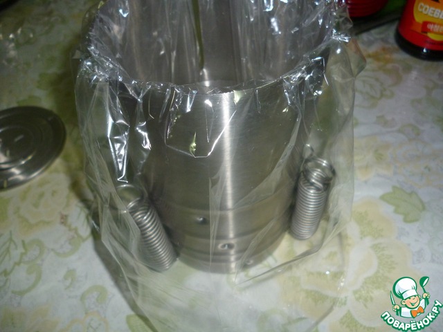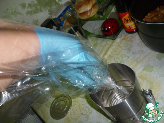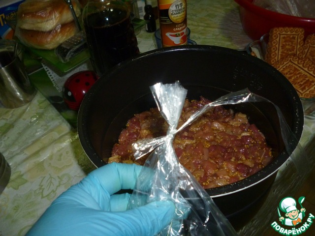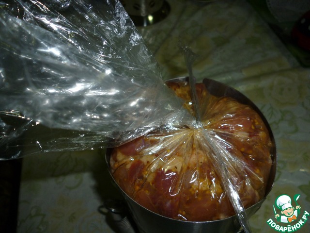 Поместить в него замаринованное мясо с приправами, хорошенько утрамбовать, вытесняя воздух, чтобы не было пустот.