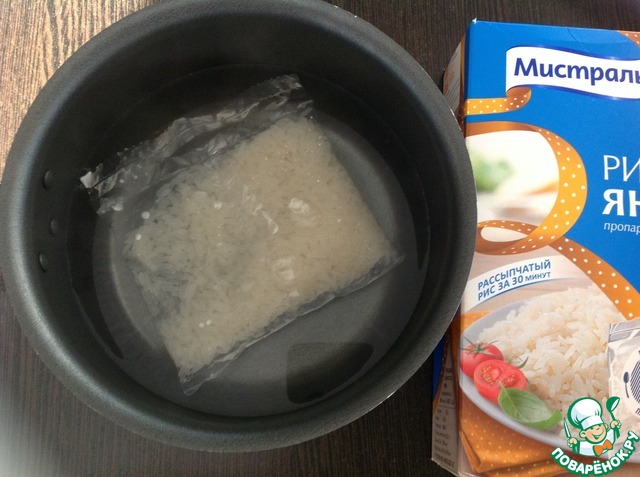 В кастрюлю налить воду, посолить, довести до кипения и добавить рис в пакетах. Я использовала рис в пакетах ТМ Мистраль "Янтарь". Варить 30 минут.