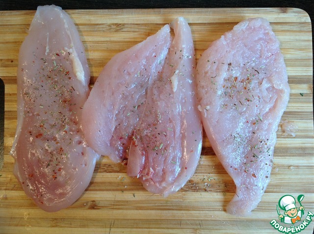 Куриную грудку вымыть и обсушить. Кожу удалить, вырезать 2 филе. Нарезать куриное филе поперек волокон полосками шириной 2 см. Слегка отбить молотком.