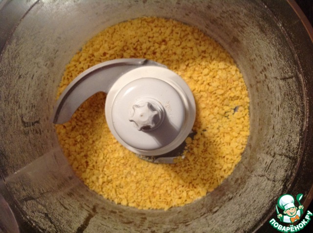 Кукурузные хлопья измельчить в блендере. Можно воспользоваться старым способом: всыпать хлопья в прочный полиэтиленовый пакет и измельчить при помощи скалки.