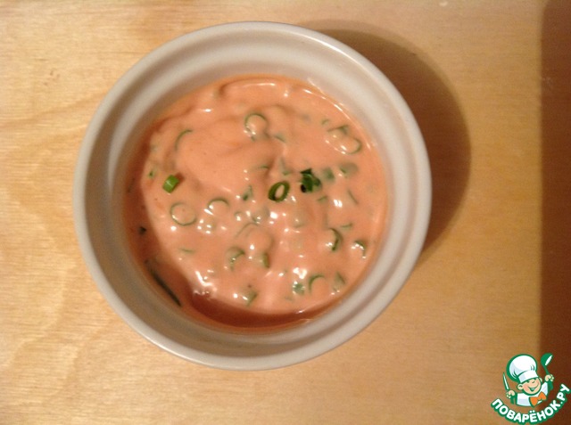 Приготовить соус. Зеленый лук сполоснуть, обсушить и мелко нашинковать. В миске смешать кетчуп, майонез и зелёный лук.