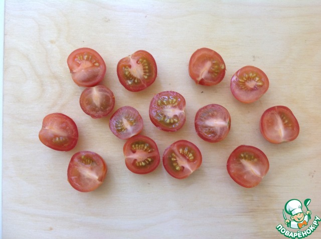Помидоры помыть и нарезать дольками. Если используются черри - разрезать пополам.