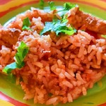 Разгрести середину сотейника и налить туда томатный соус. Я взяла домашний кетчуп, с сахаром и уксусом. Если брать томатный соус, то остринку выправляйте по факту и вкусу. Прогреть соус с минутку, перемешать и влить вино. Посыпать пряностями и дать вину наполовину выпариться. Посолить, хорошо перемешать и накрыв крышкой, тушить до готовности риса.