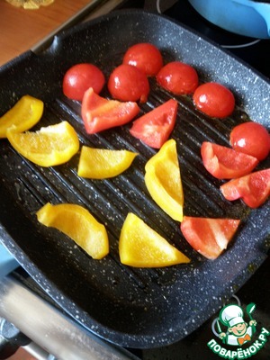 Заранее на сковороде-гриль обжарила кабачки, лук, перец и помидоры. И гарнир отличный и сковорода разогрелась как нужно!