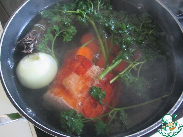 В кастрюлю положить овощи, травы, добавить 3 л воды, если мясо не соленое, то воду нужно хорошо посолить. Довести до кипения, добавить мясо и варить под крышкой на медленном огне 1 ч 15 мин. Извлечь и полностью остудить, обсушить.