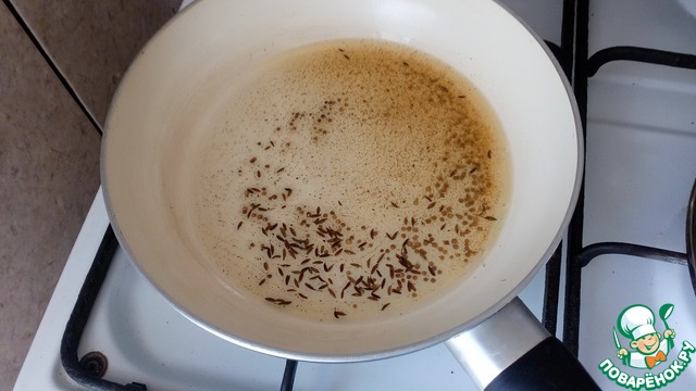 Нагрейте растительное масло (если у Вас есть гхи – используйте его), добавьте семена горчицы и кумина. Пассеруйте, пока семена не начнут потрескивать, затем добавьте остальные специи. Хорошо перемешайте и готовьте 30 секунд.