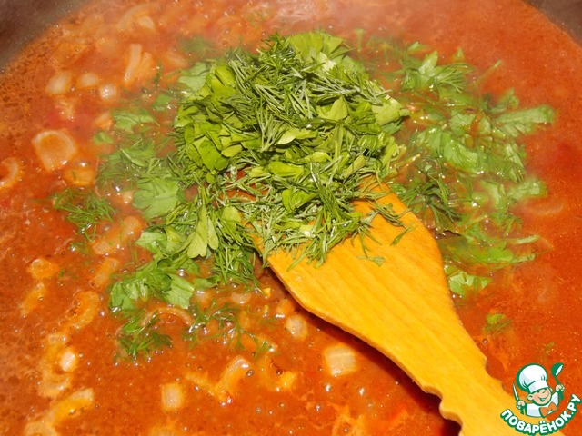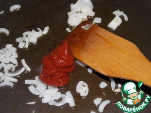 • Добавить томатную пасту и влить немного воды. Тушить 5 минут на медленном огне, постоянно помешивая.