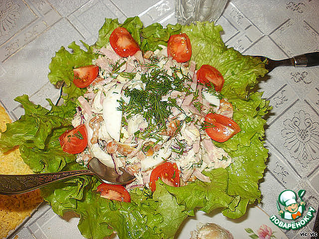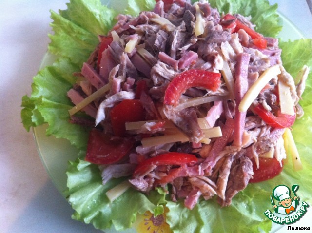 Вообще для этого салата нужно три вида мяса, можно брать любое мясо на ваше усмотрение (вареное, копченое, свинину, говядину, курицу, язык и т.д).