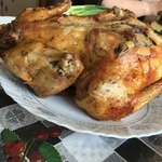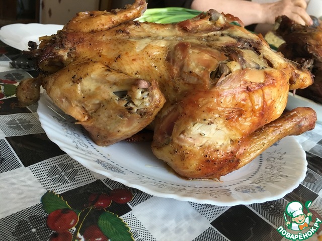 Смазать курицу сливочным маслом и выпекать при 180 градусах в середине духового шкафа 70 минут.
